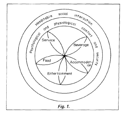 The outer, primary interacting element is that of the social relationship fostered by the warm, friendly, welcoming, courteous, open, generous behaviour of the host, creating the hospitable social environment. This supports and promotes the positive feeling of security and comfort created by the physical structure, design, decor and location of the facility. Finally, the provision of accommodation facilities to sleep, eat, relax and wash, together with the supply of food, beverage, service and entertainment.